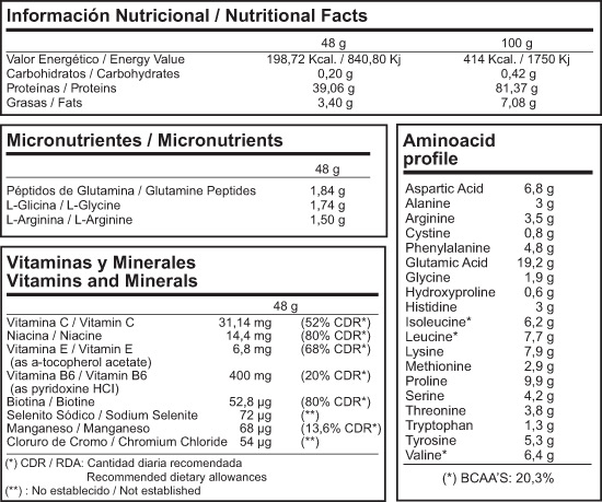 Ademas viene reforzada con los siguientes aminoacidos: L-gutamina, L-glicina y L-arginina.